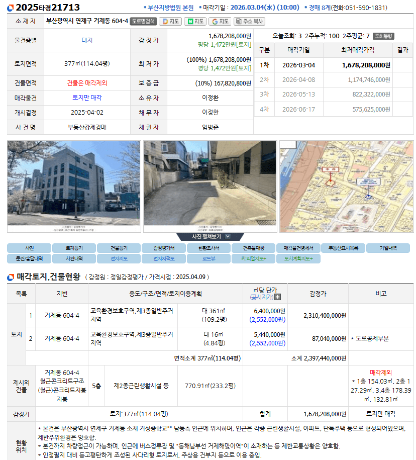 소재지: 부산 연제구 거제동 604-4 (대지 114평, 제3종일반주거지역)